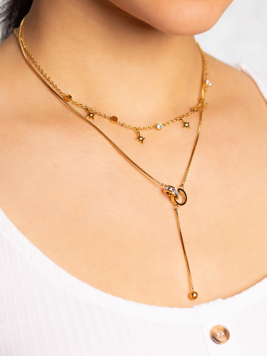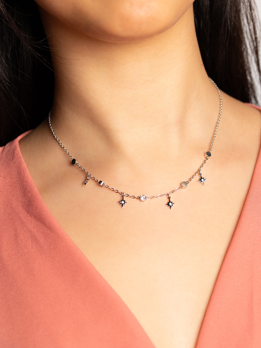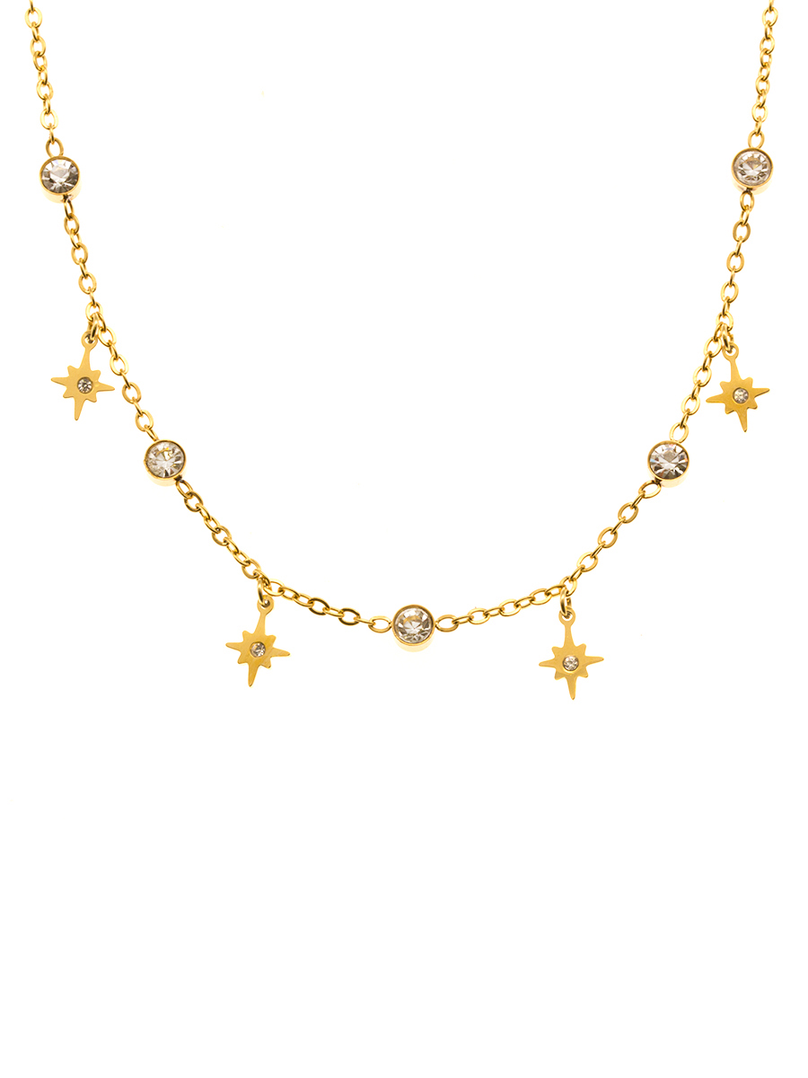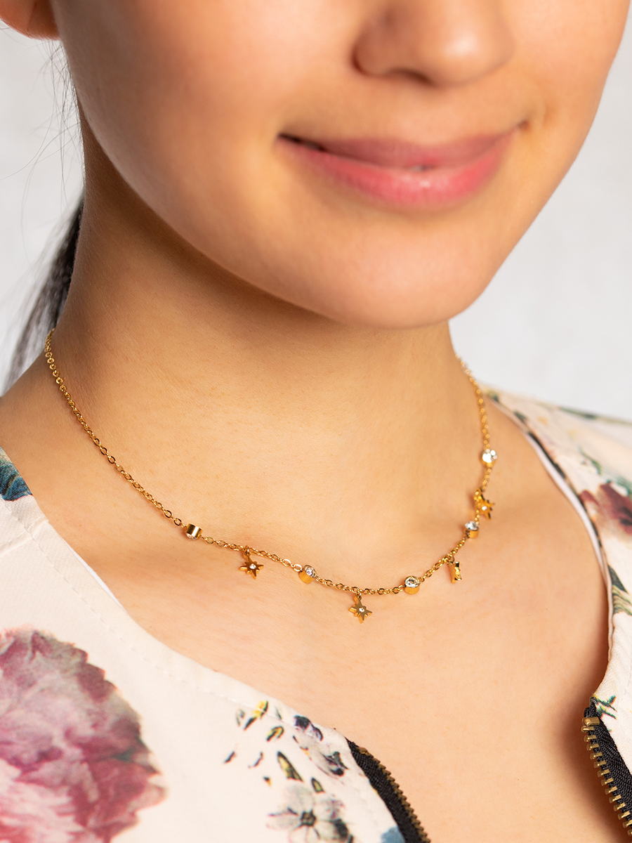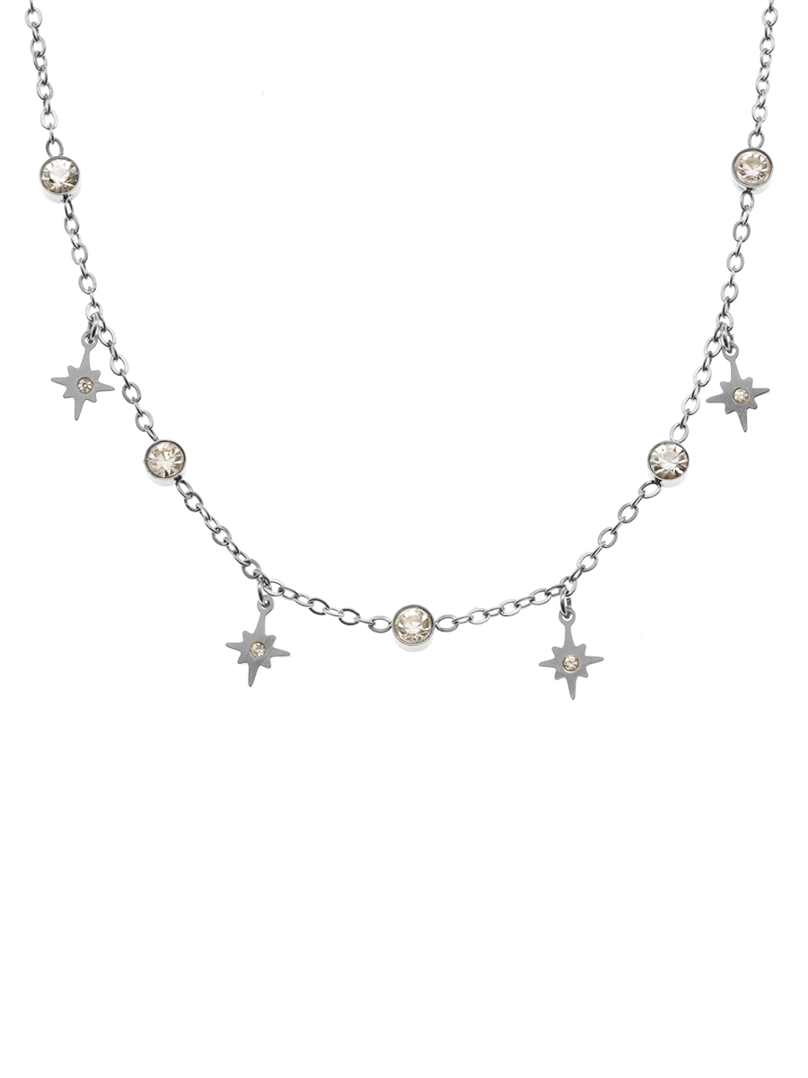 Diese feine Edelstahl Ankerkette ist mit Kristallen und hängenden Sternchen verziert, sie ist verspielt und lässt sich mit anderen Ketten als Layering-Look kombinieren. Diese feine Kette ist besonders hautverträglich, läuft nicht an und rostet nicht. Dieses Schmuckstück ist frei von Nickel, Blei und Cadmium. Diese schöne Kette ist in zwei Farben erhältlich: silber und vergoldet.