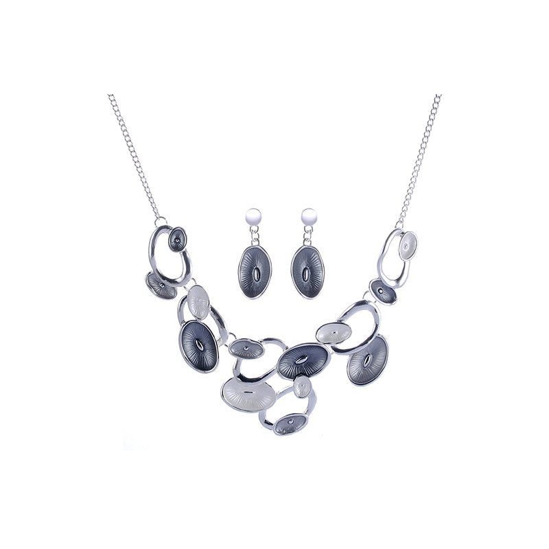 Unser Klarissa Schmuckset ist ein zweiteiliges Schmuckset bestehend aus den Klarissa Ohrsteckern und der Klarissa Schmuckkette. Die Form besteht aus kleinen oval-förmigen Elementen, die in unterschiedlichen Formen und Größen miteinander kombiniert wurden. Die Halskette zaubert ein wunderschönes Dekolleté und ist einreihig, die passenden Ohrringe schaffen durch ihre Form und ihre Größe einen echten Hingucker im mittleren Gesichtsbereich.